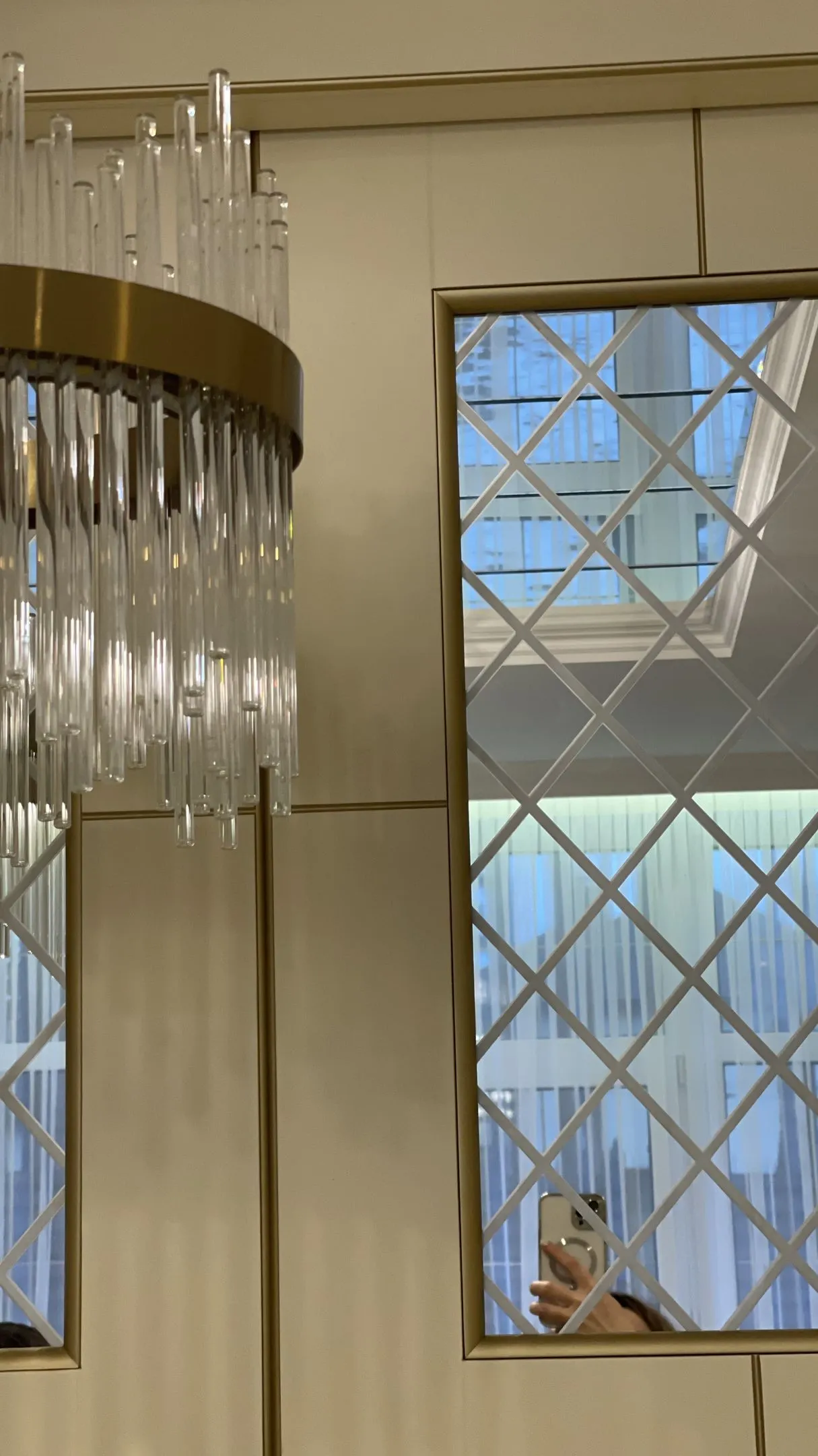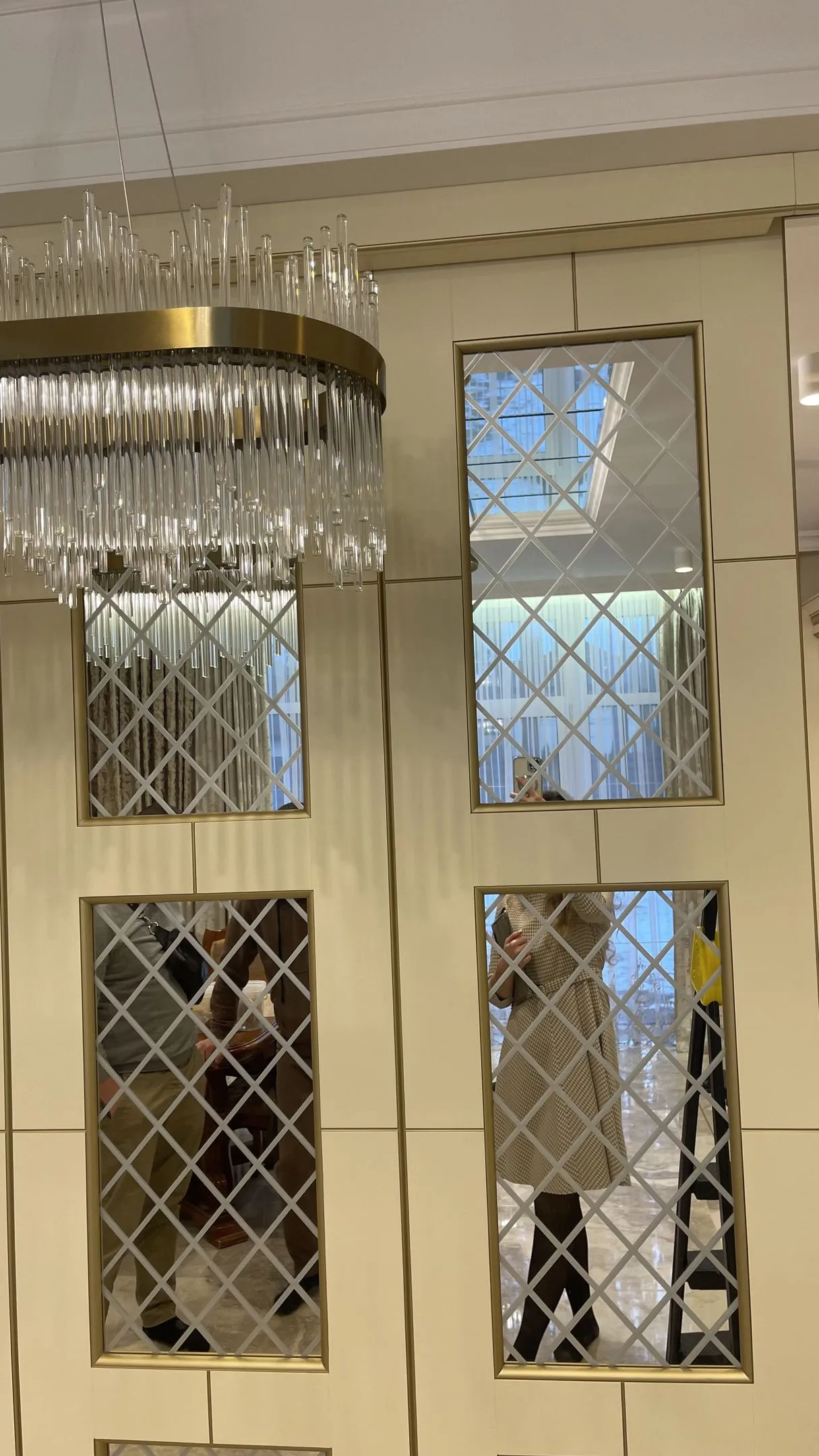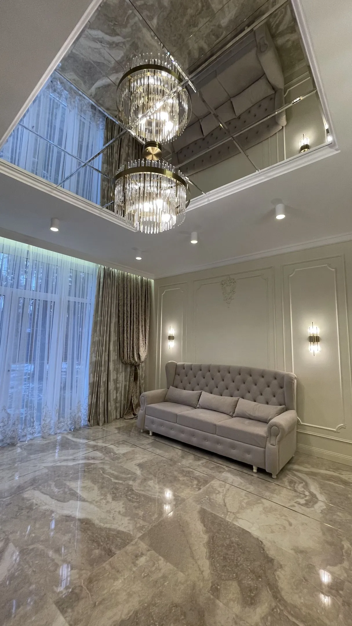 Интересным дизайнерским решением в данном проекте является использование зеркал на потолке, что зрительно увеличивает высоту помещения. Также к интерьеру добавляет дизайнерская перегородка, отграничивающая зону гостиной от кухни.