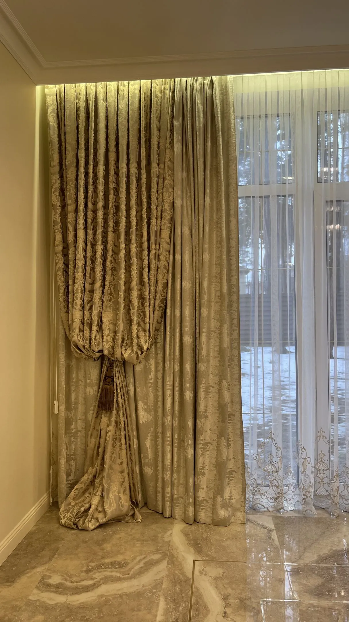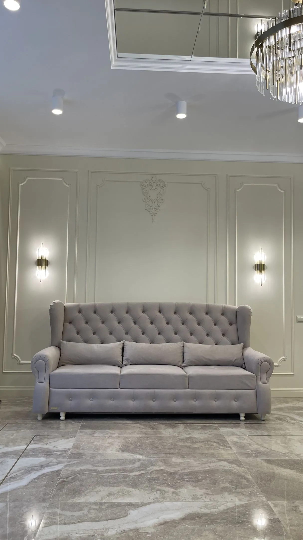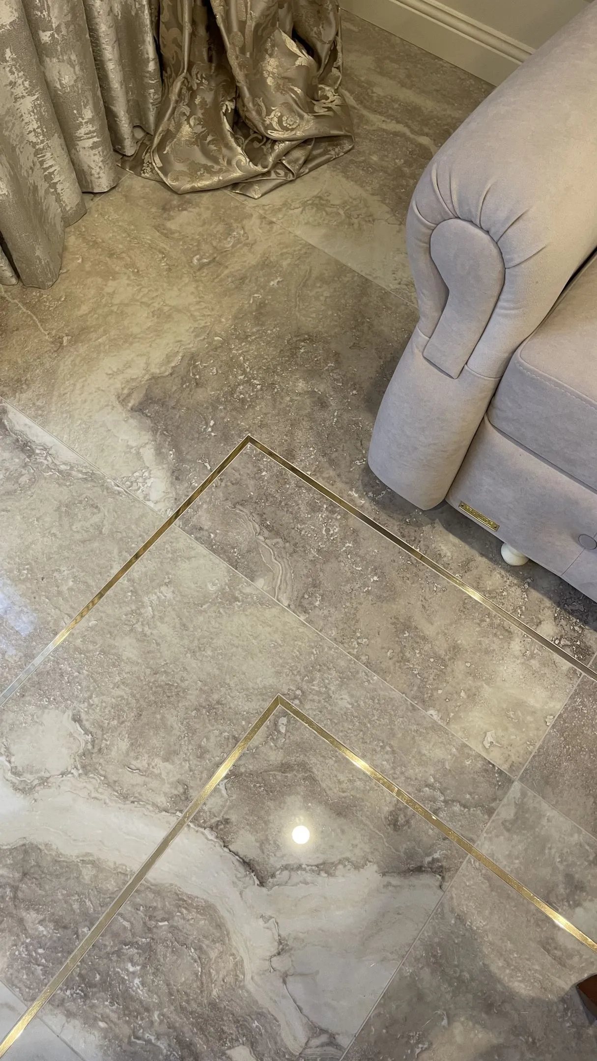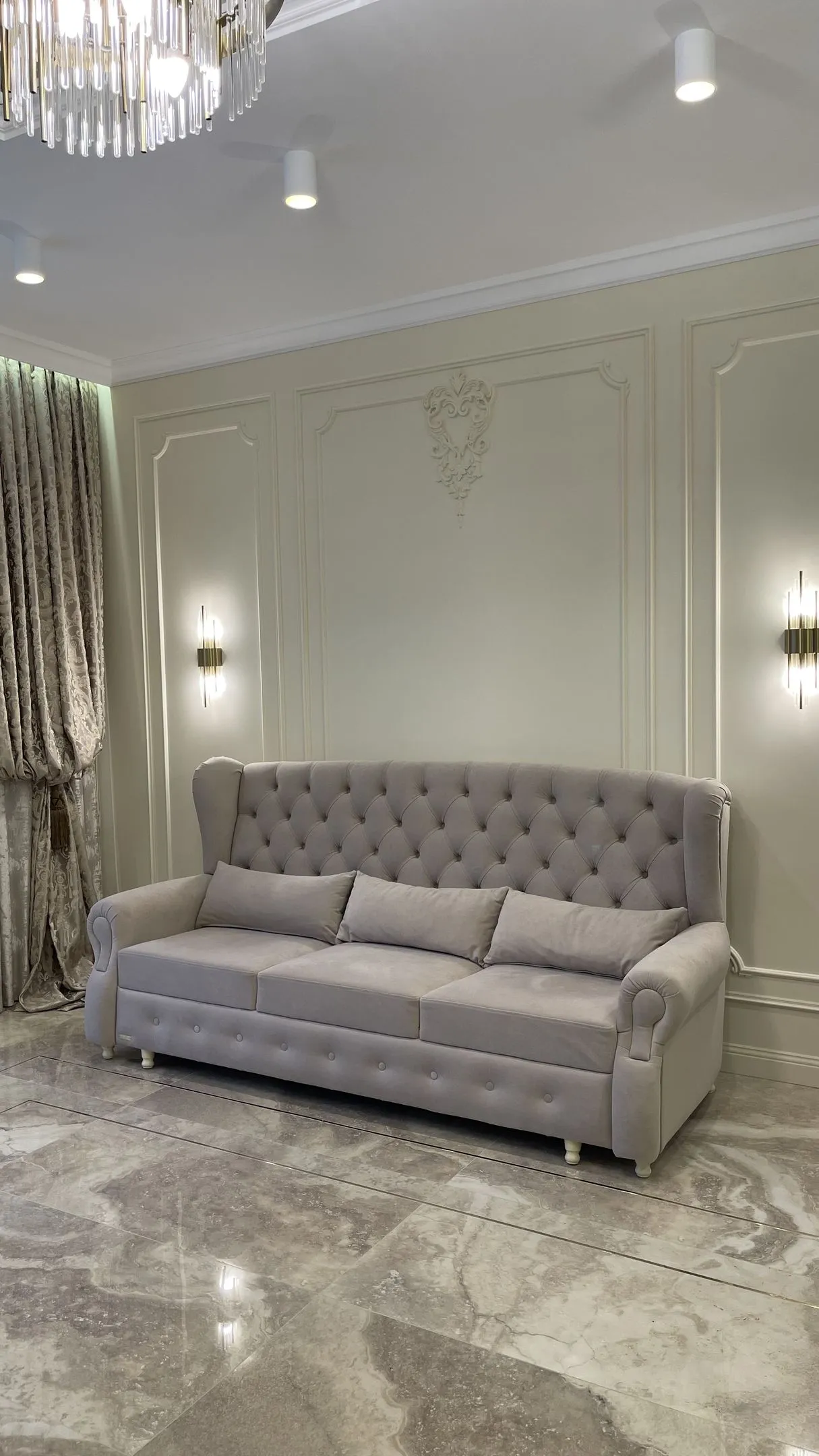 Также в данном интерьере мы изменили напольное покрытие и материал фартука на кухне на роскошный керамогранит испанского производителя. Текстура камня подчеркивает изысканность интерьера и создает необыкновенную атмосферу неповторимости.