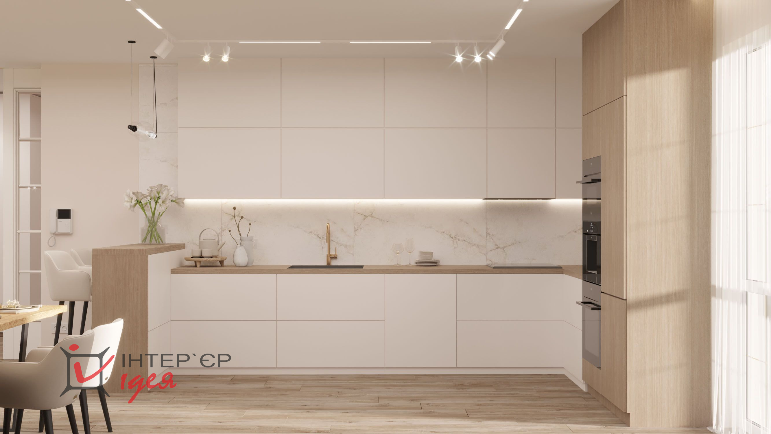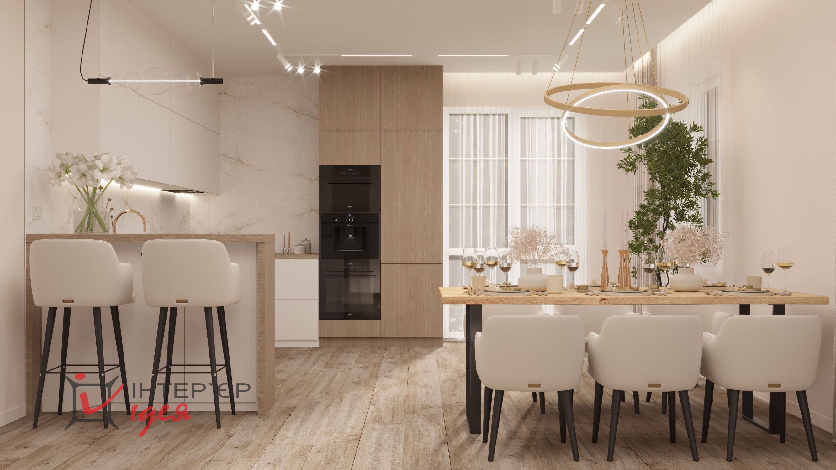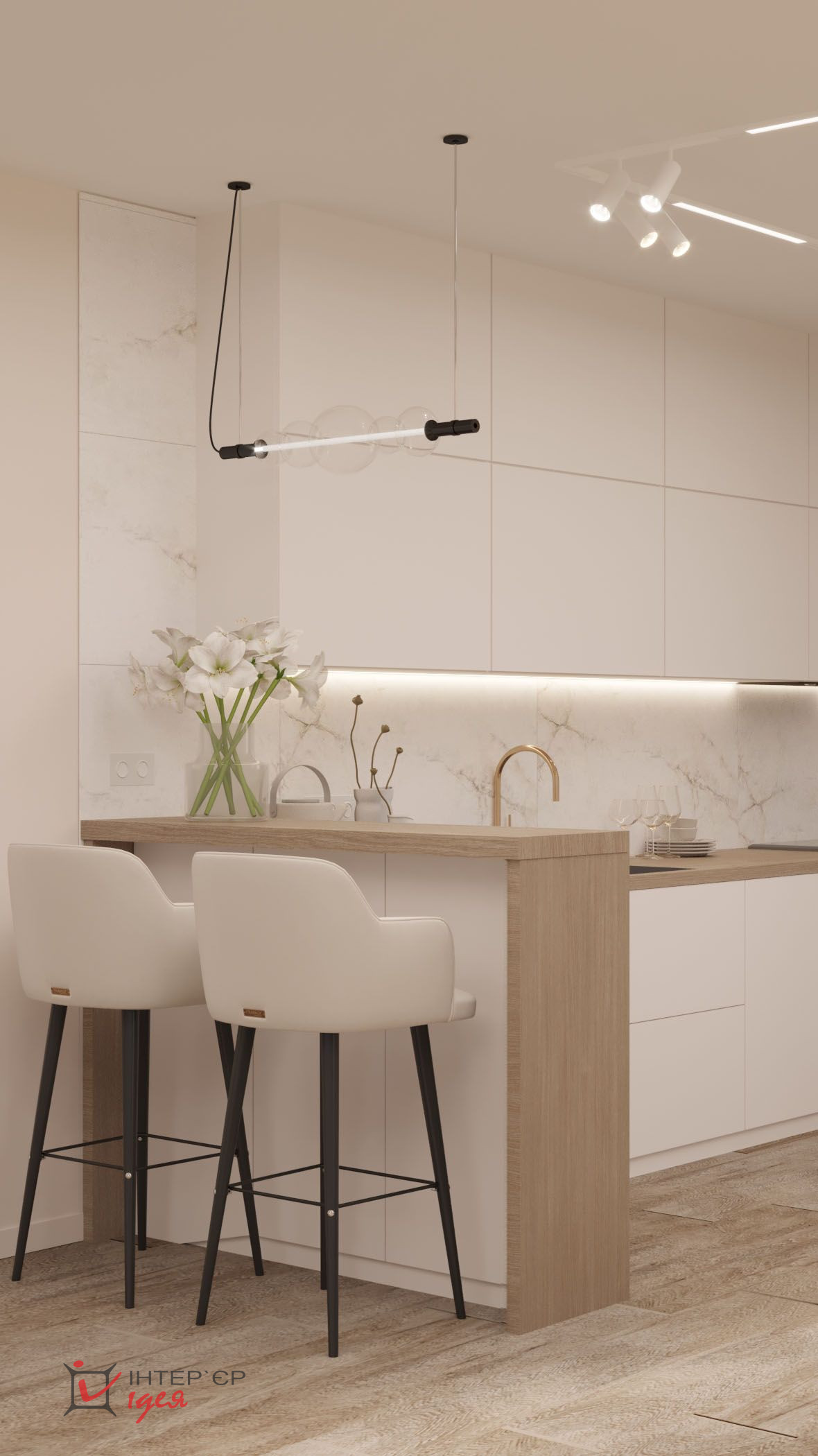 Светлые кремовые и деревянные оттенки гармонично сочетаются с мраморной текстурой на стене кухонной зоны. Барные стулья и стулья для обеденного стола имеют мягкую обивку, что придает комфорт. Элегантные люстры геометрической формы с мягкой подсветкой придают интерьеру изящество. Природные материалы, деревянные полы и декор в виде живых растений создают ощущение тепла и естественности.