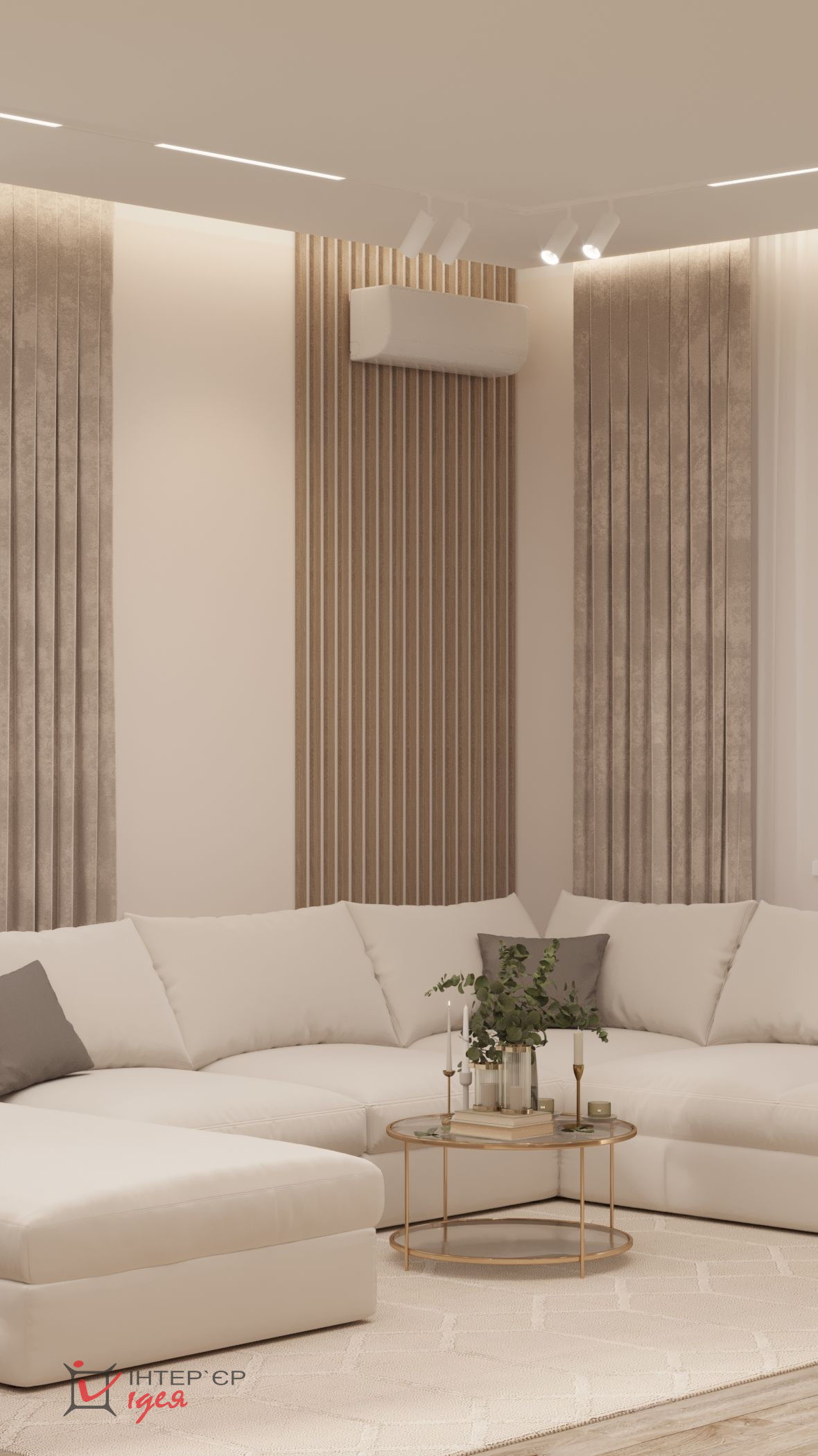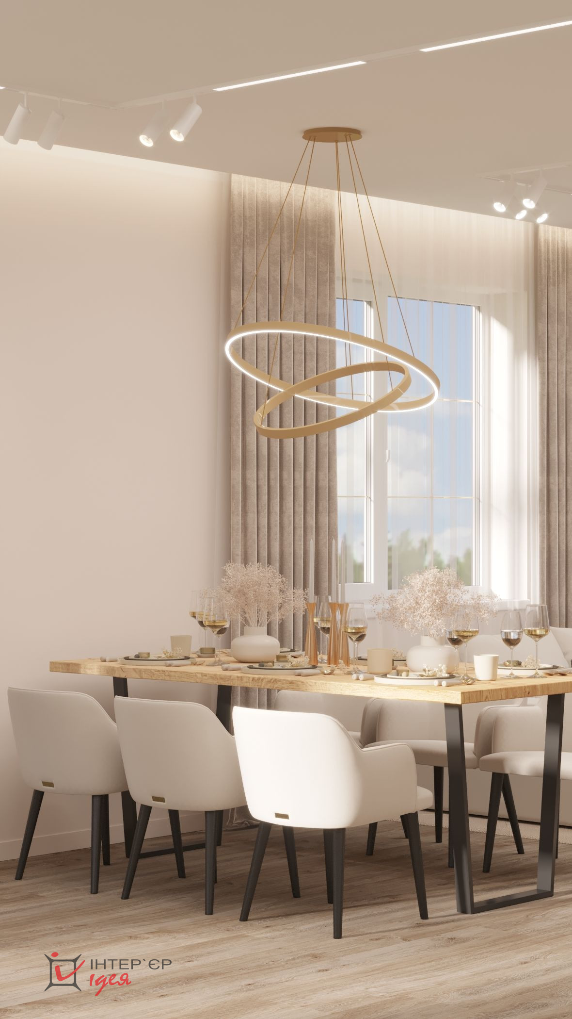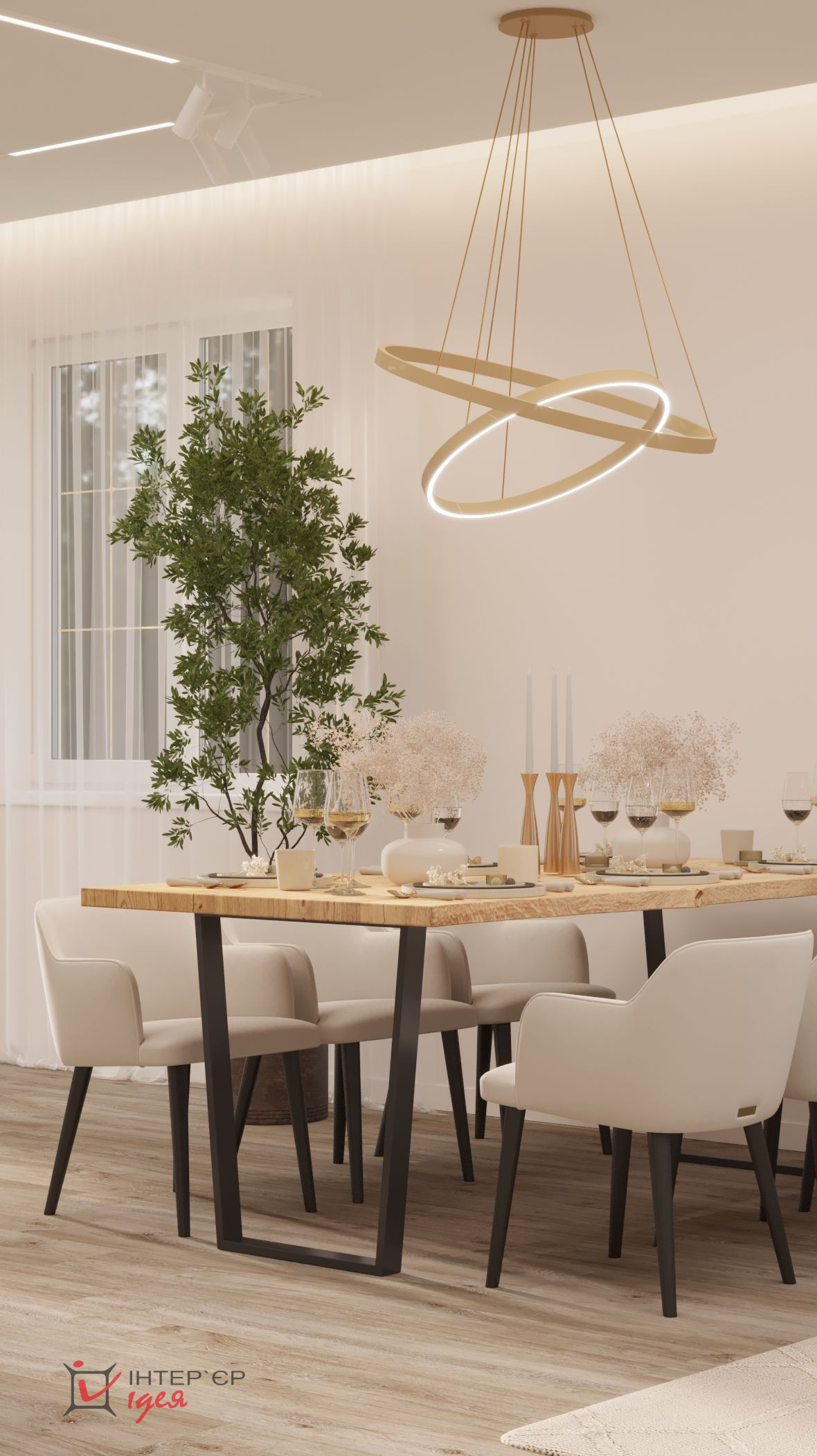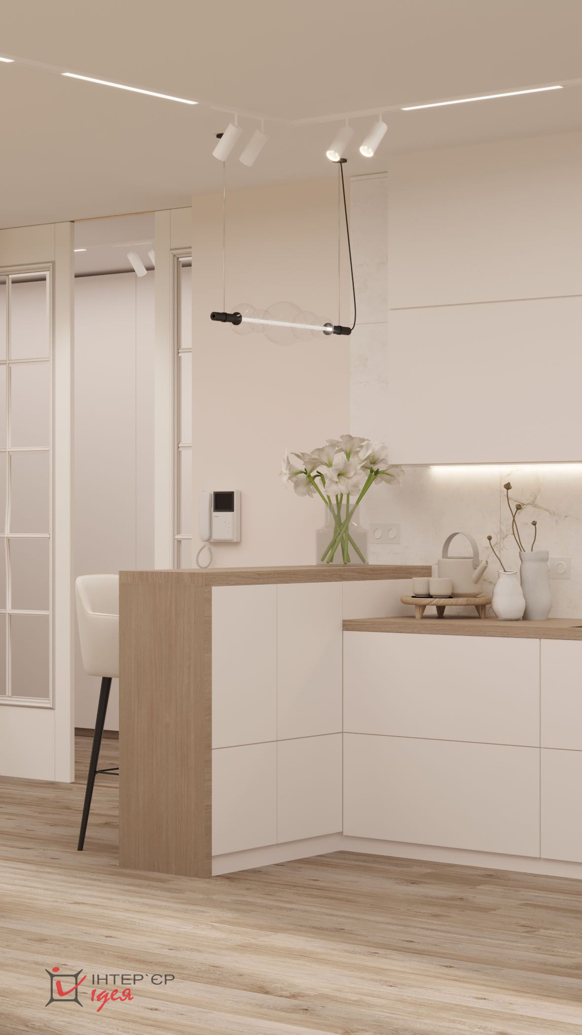 Светлые кремовые и деревянные оттенки гармонично сочетаются с мраморной текстурой на стене кухонной зоны. Барные стулья и стулья для обеденного стола имеют мягкую обивку, что придает комфорт. Элегантные люстры геометрической формы с мягкой подсветкой придают интерьеру изящество. Природные материалы, деревянные полы и декор в виде живых растений создают ощущение тепла и естественности.