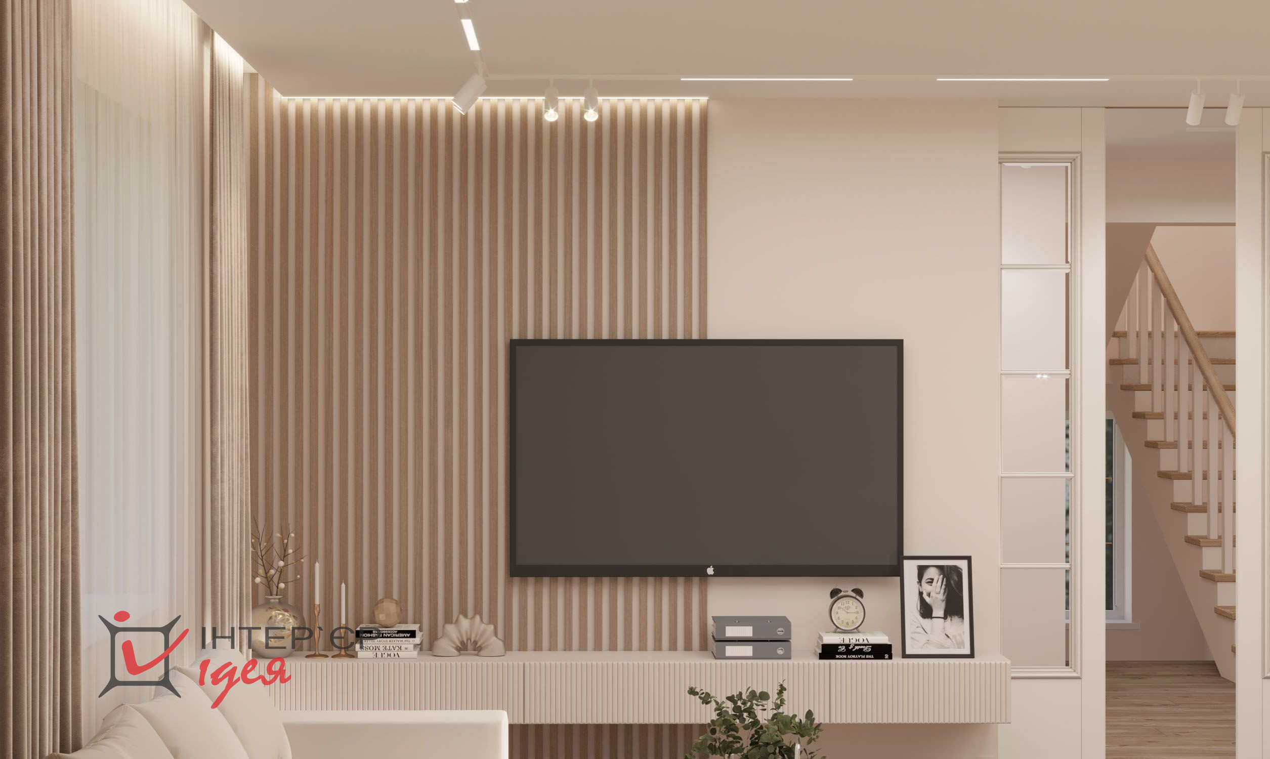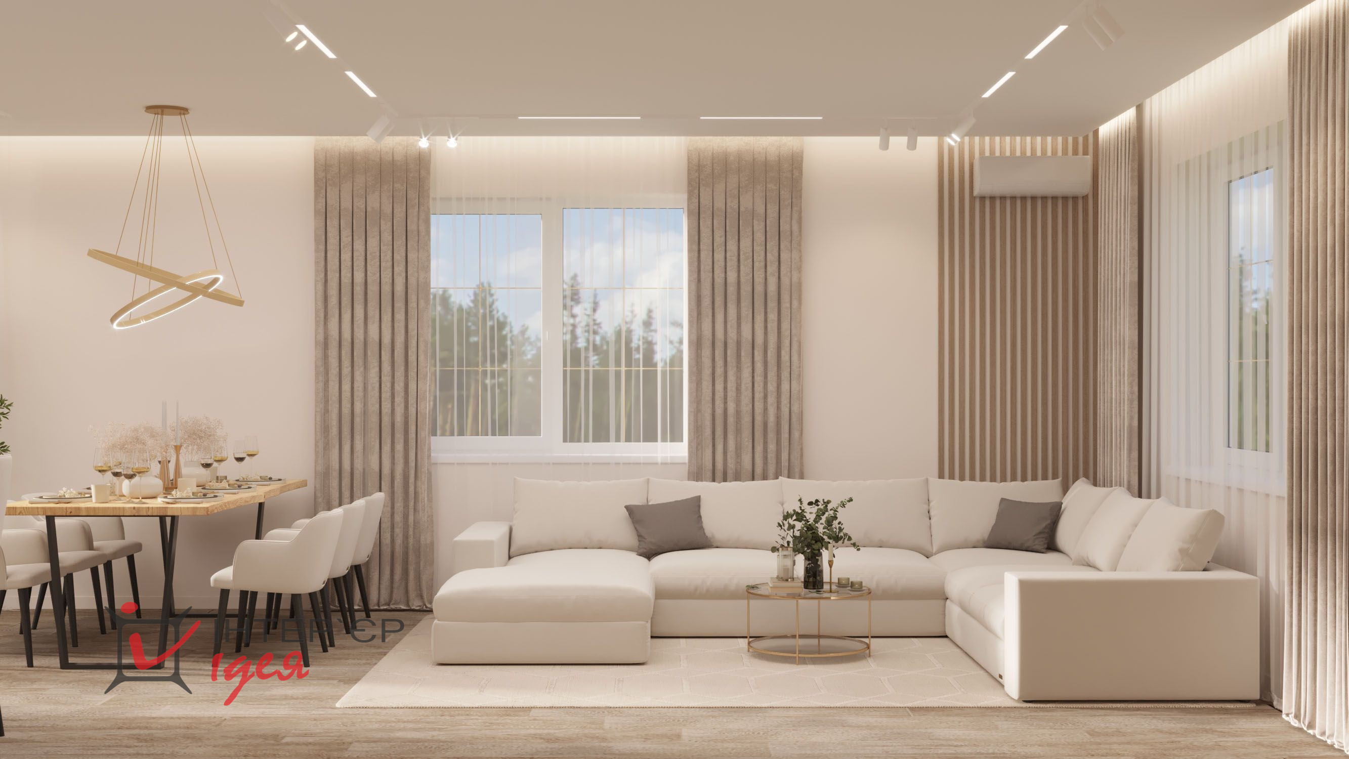 Этот интерьер исполнен в стиле современного минимализма с элементами скандинавского дизайна. Пространство объединяет кухню и гостиную, создавая светлую уютную и просторную атмосферу.