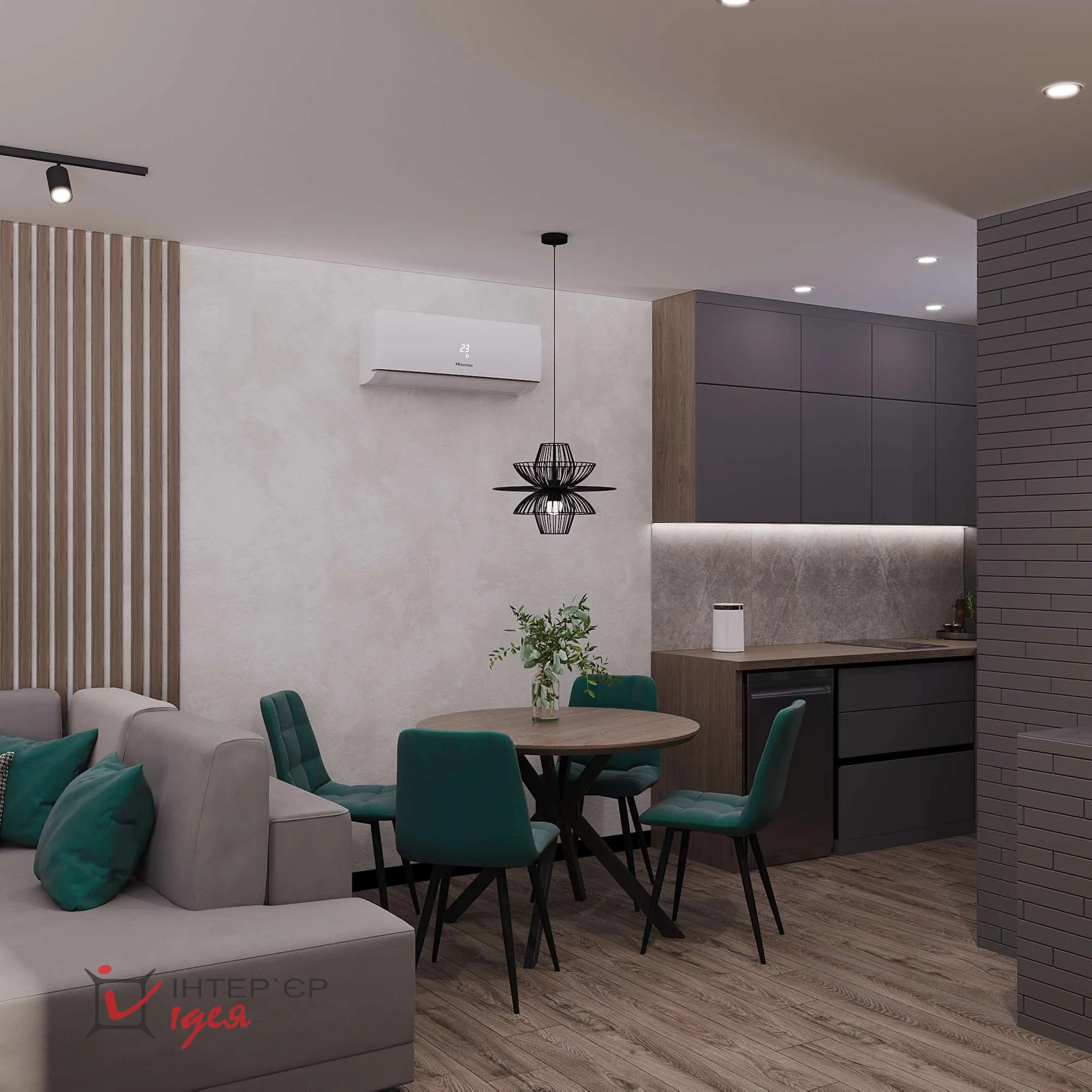 В маленьком пространстве удалось разместить кухню, обеденную зону и зону отдыха с большим диваном и телевизором.