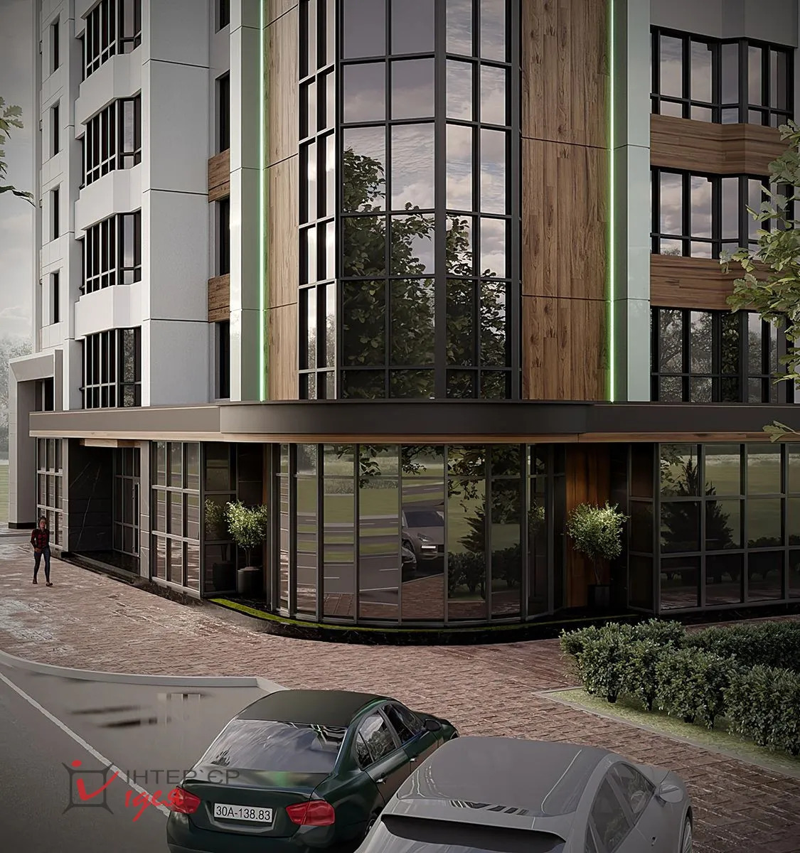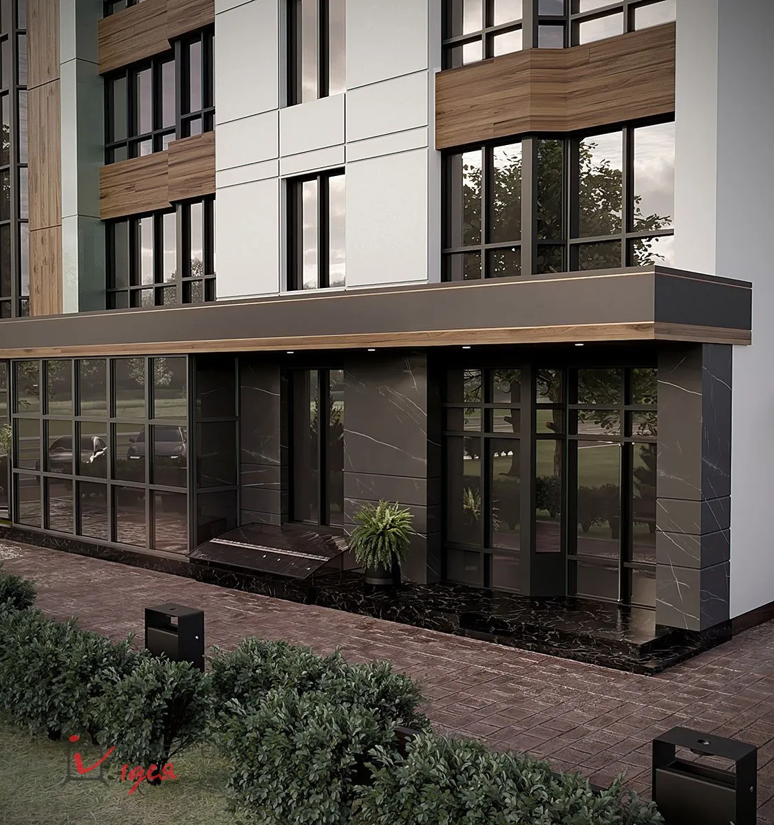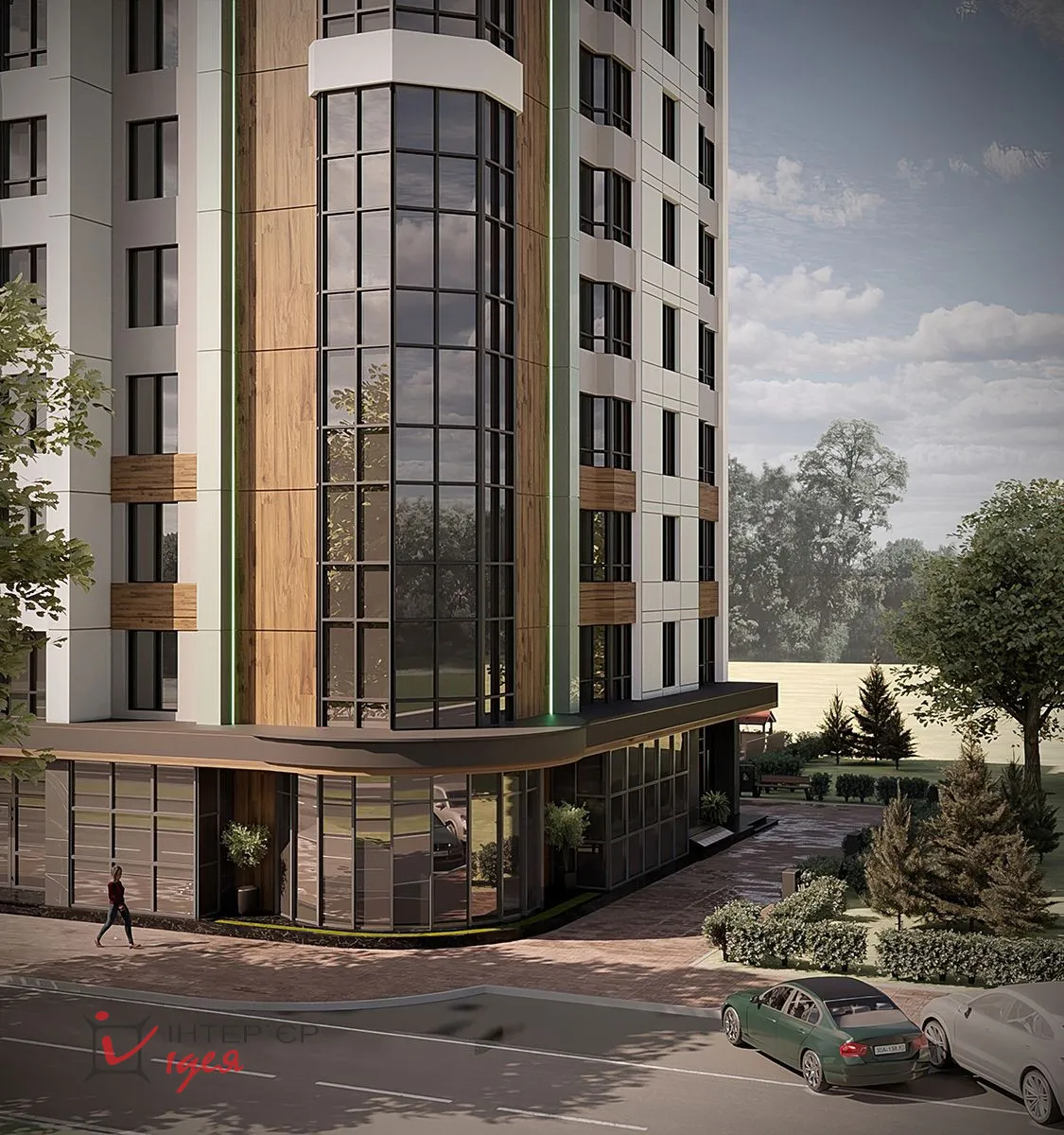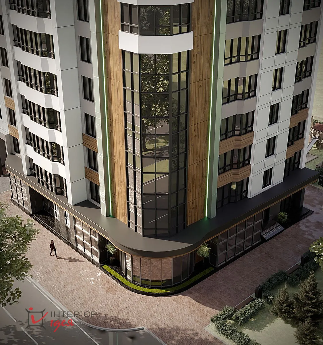 Угловой стеклянный эркер пронизывает весь корпус по вертикали и с двух сторон выделен опускающимися к первому этажу панелями под дерево, образуя ниши, где расположено декоративное озеленение. Периметр этой угловой части выше первого этажа обрамлен изящным выступом оливкового цвета со светодиодной подсветкой.