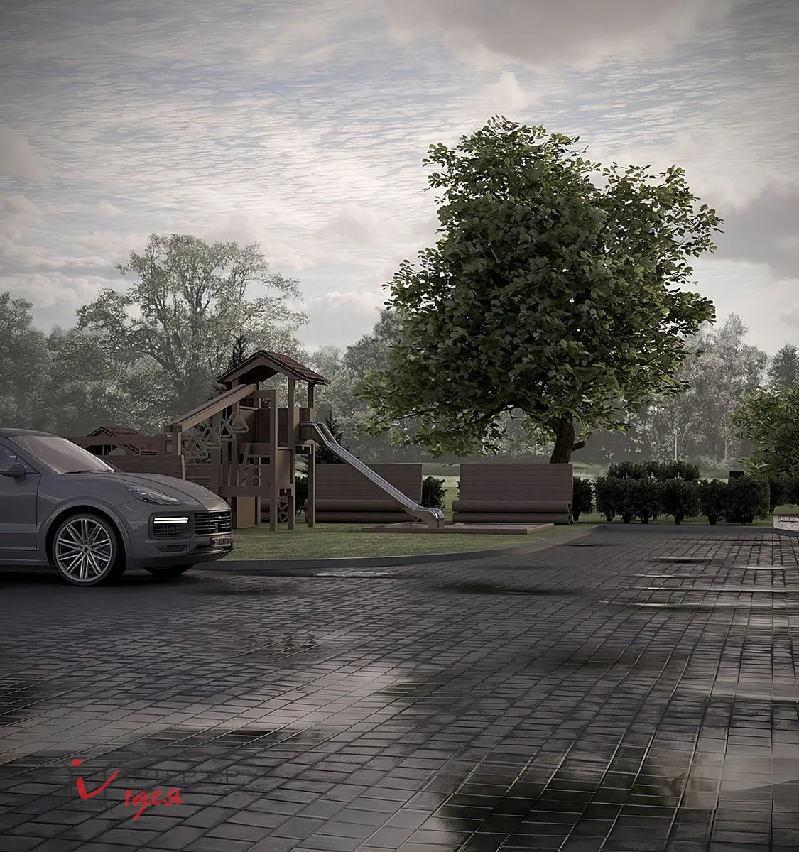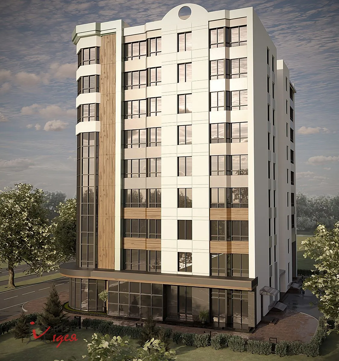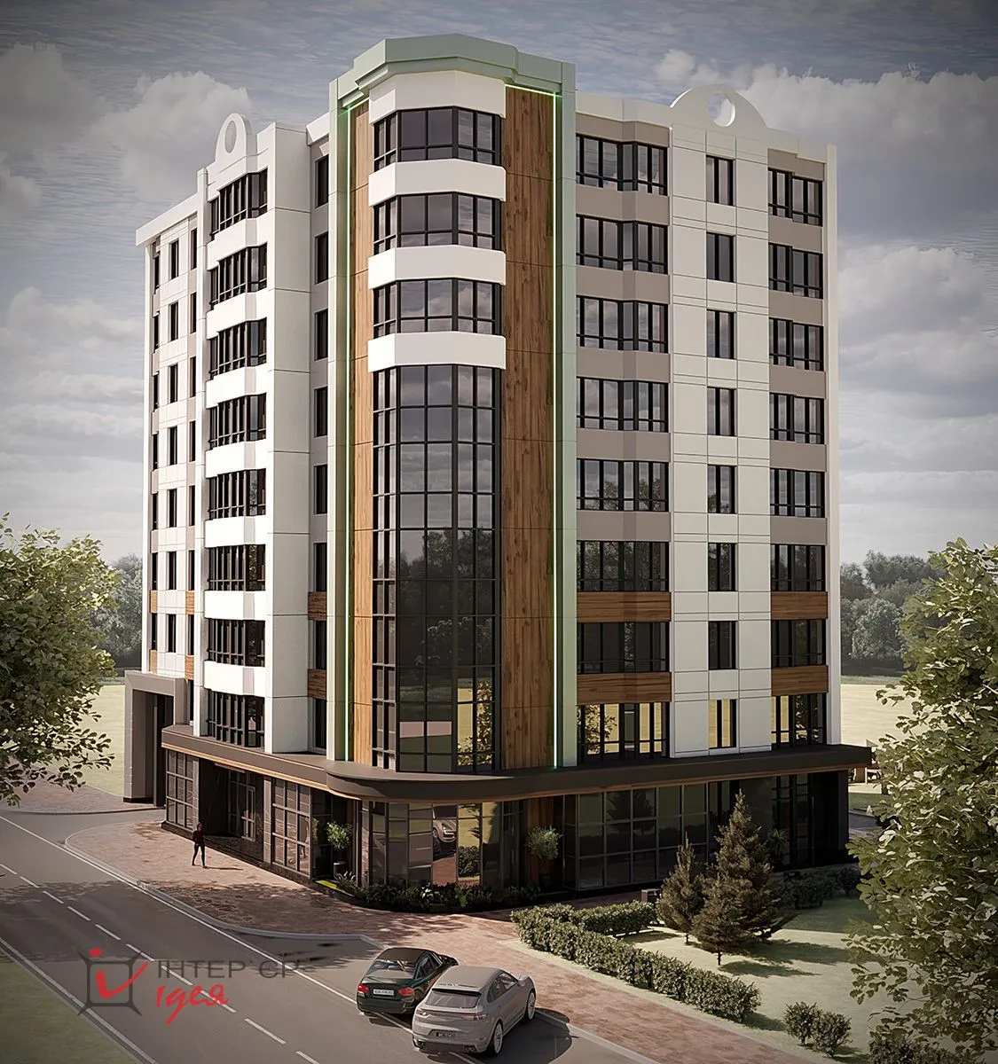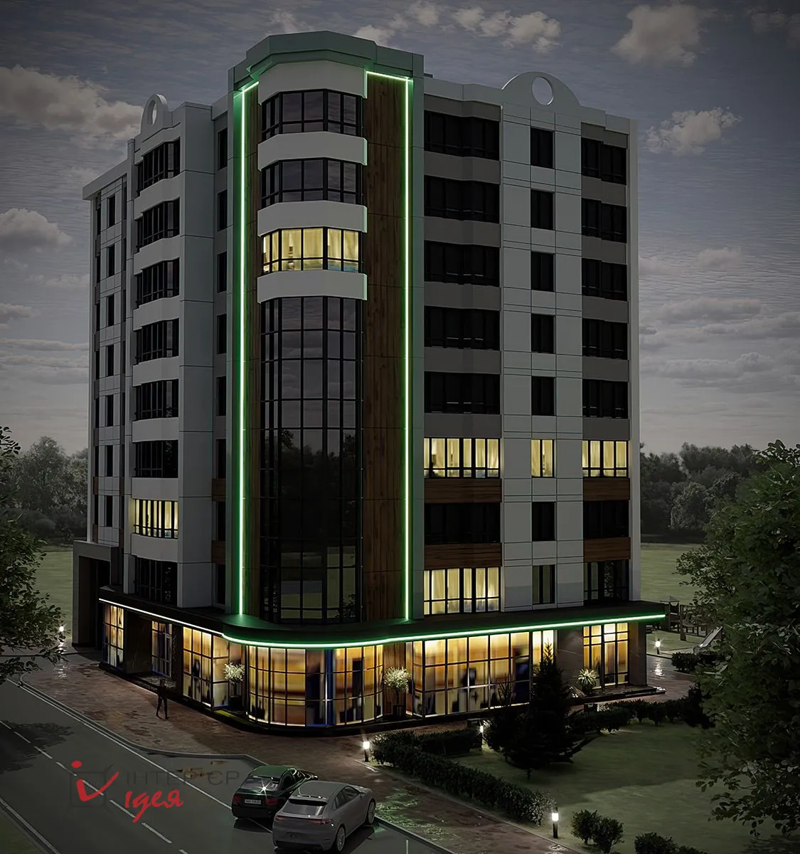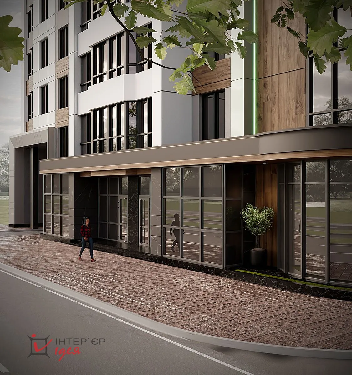Угловой стеклянный эркер пронизывает весь корпус по вертикали и с двух сторон выделен опускающимися к первому этажу панелями под дерево, образуя ниши, где расположено декоративное озеленение. Периметр этой угловой части выше первого этажа обрамлен изящным выступом оливкового цвета со светодиодной подсветкой.