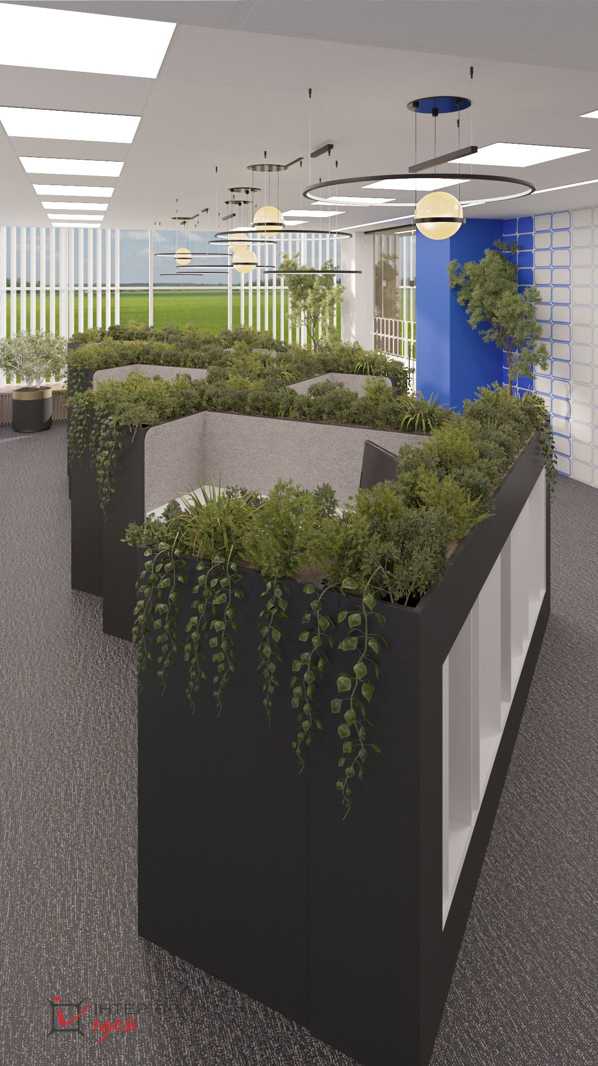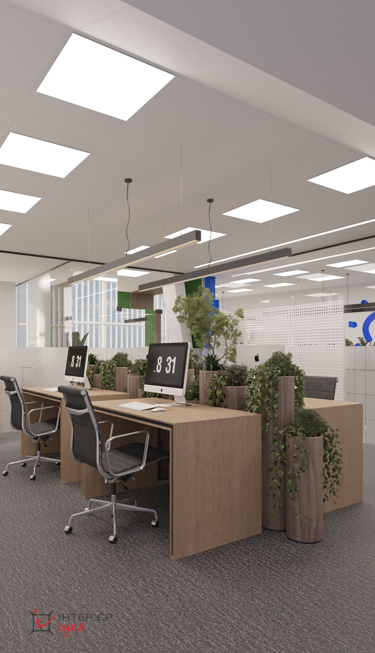 Открытая планировка офиса, разделенная на разные кабинеты с помощью стеклянных конструкций придают легкости пространству. Все продумано до мелочей: рабочие места зонированы так, чтобы обеспечить приватность и одновременно поддерживать командную динамику.