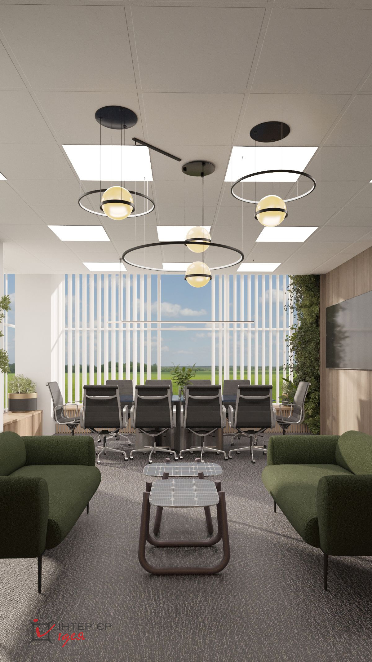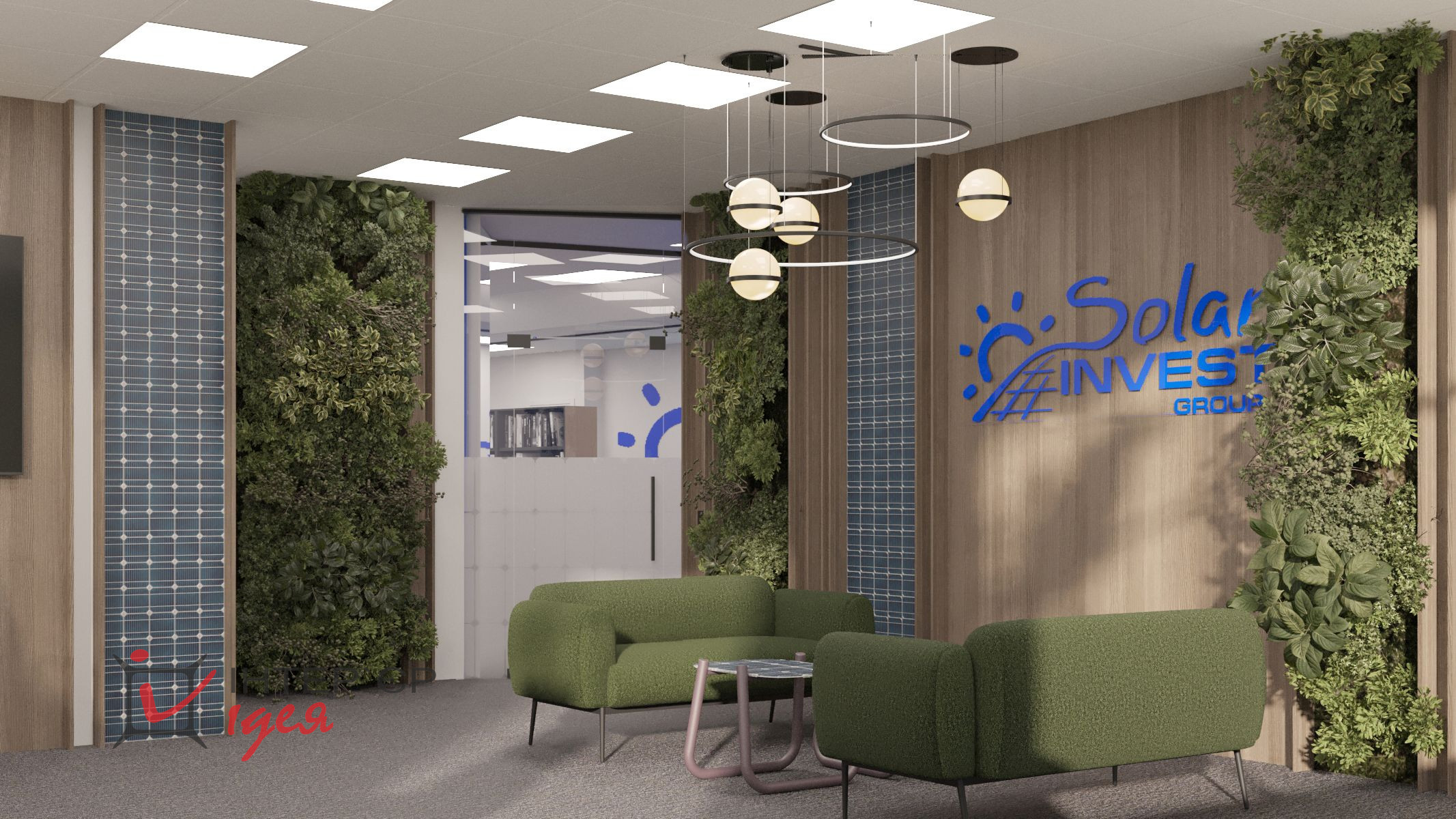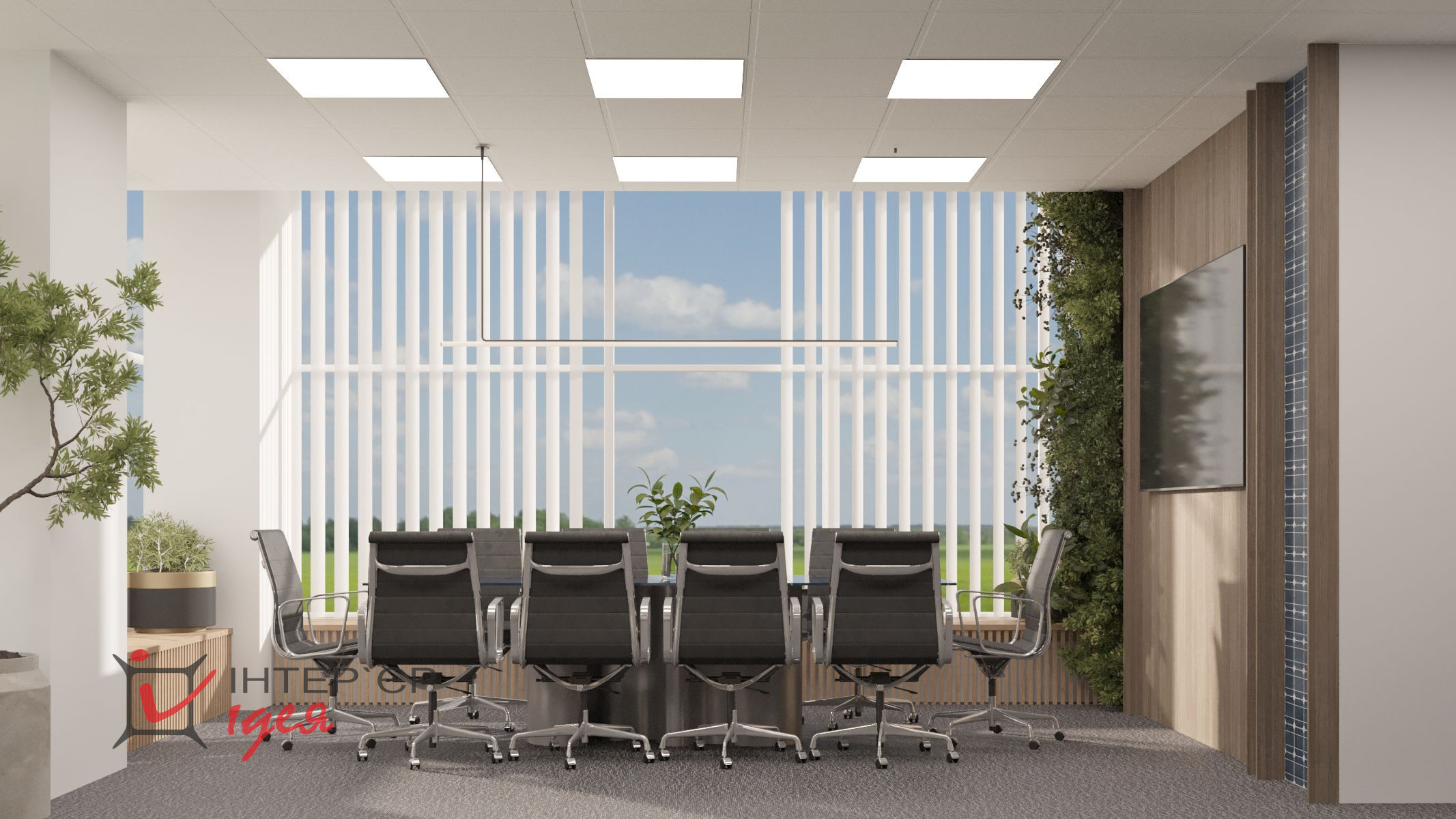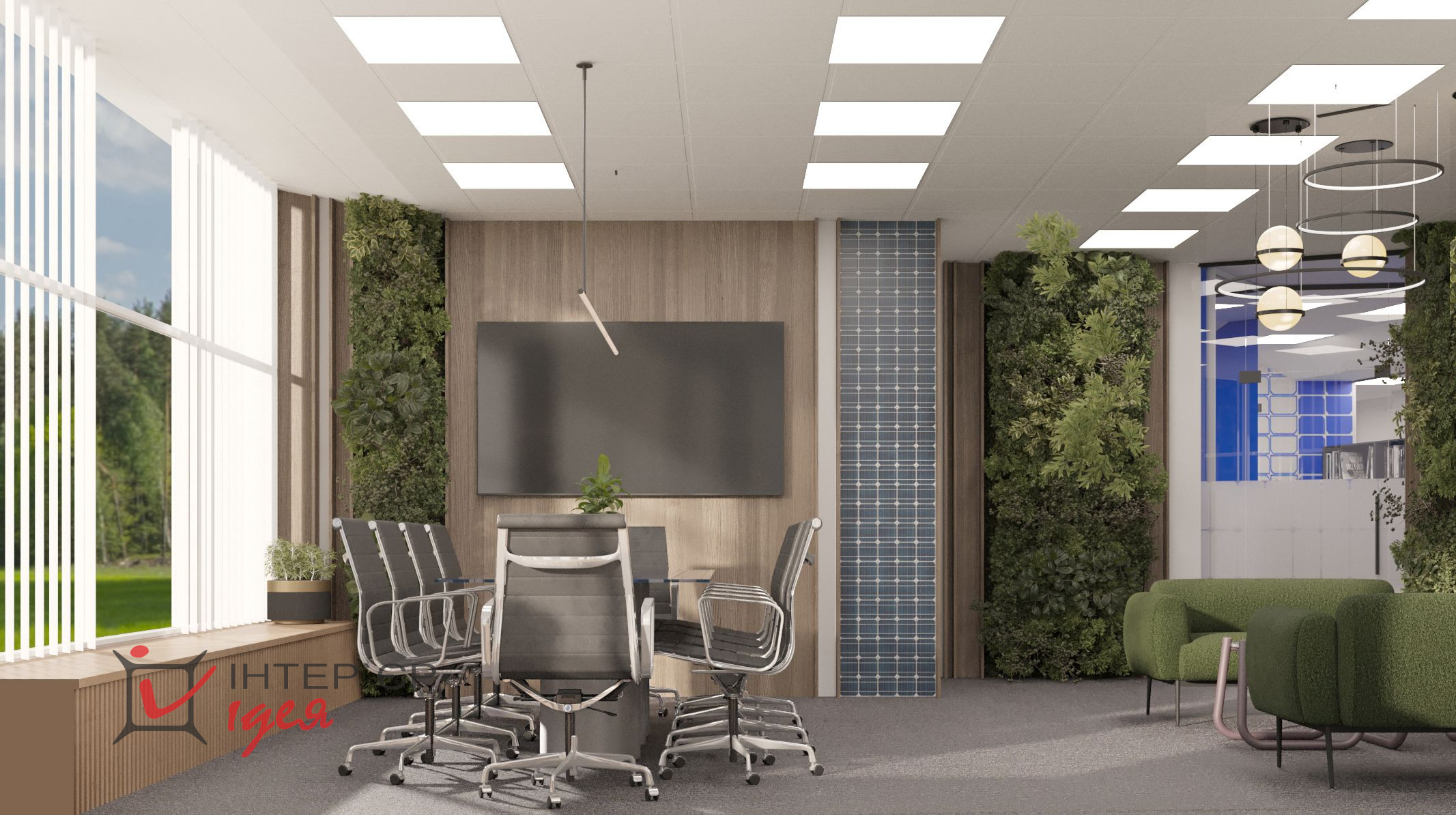 Переговорная комната с логотипом компании — это визуальный акцент, производящий первое впечатление, сочетая деревянные фактуры с живой зеленью и стильной мебелью.