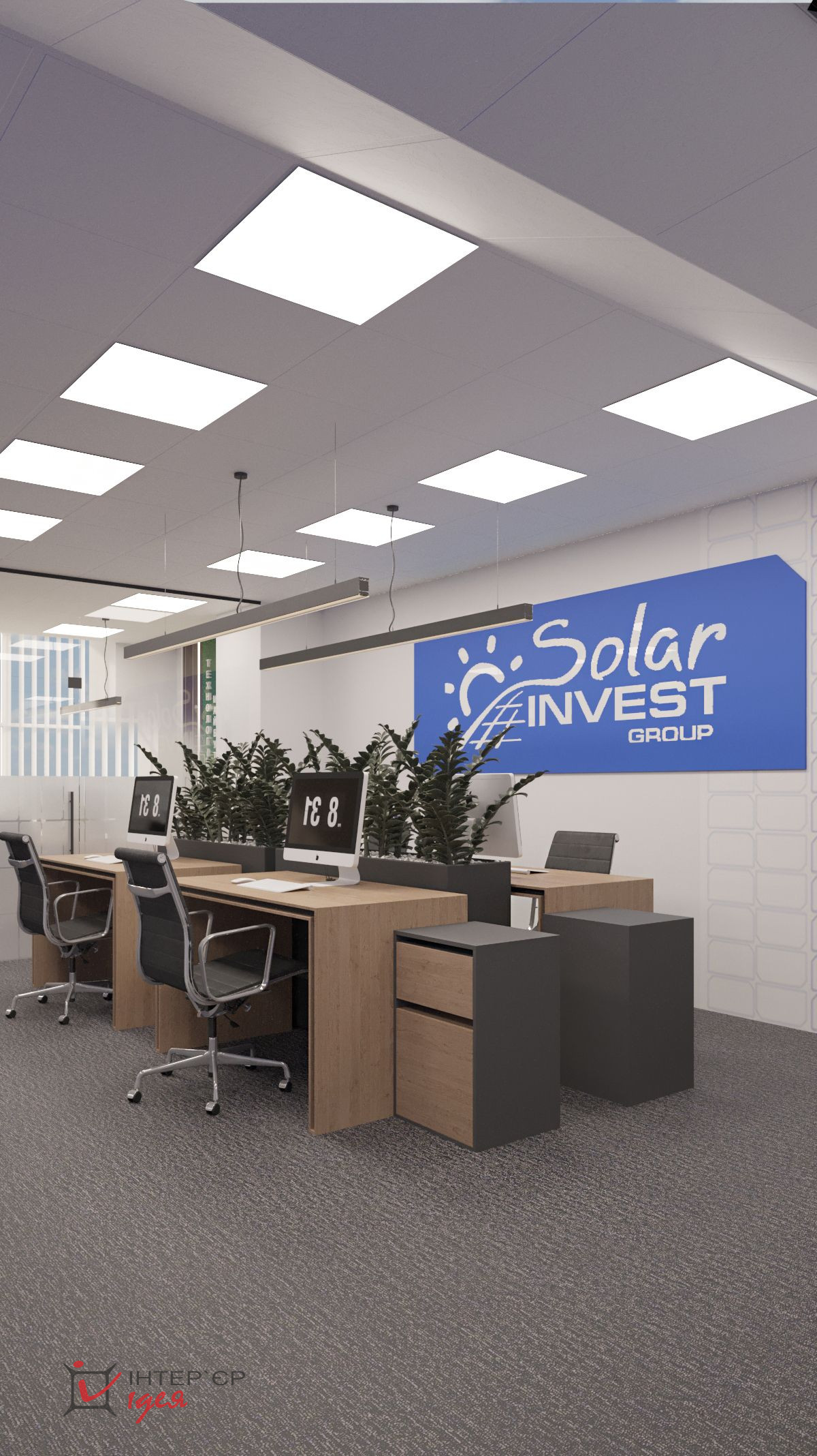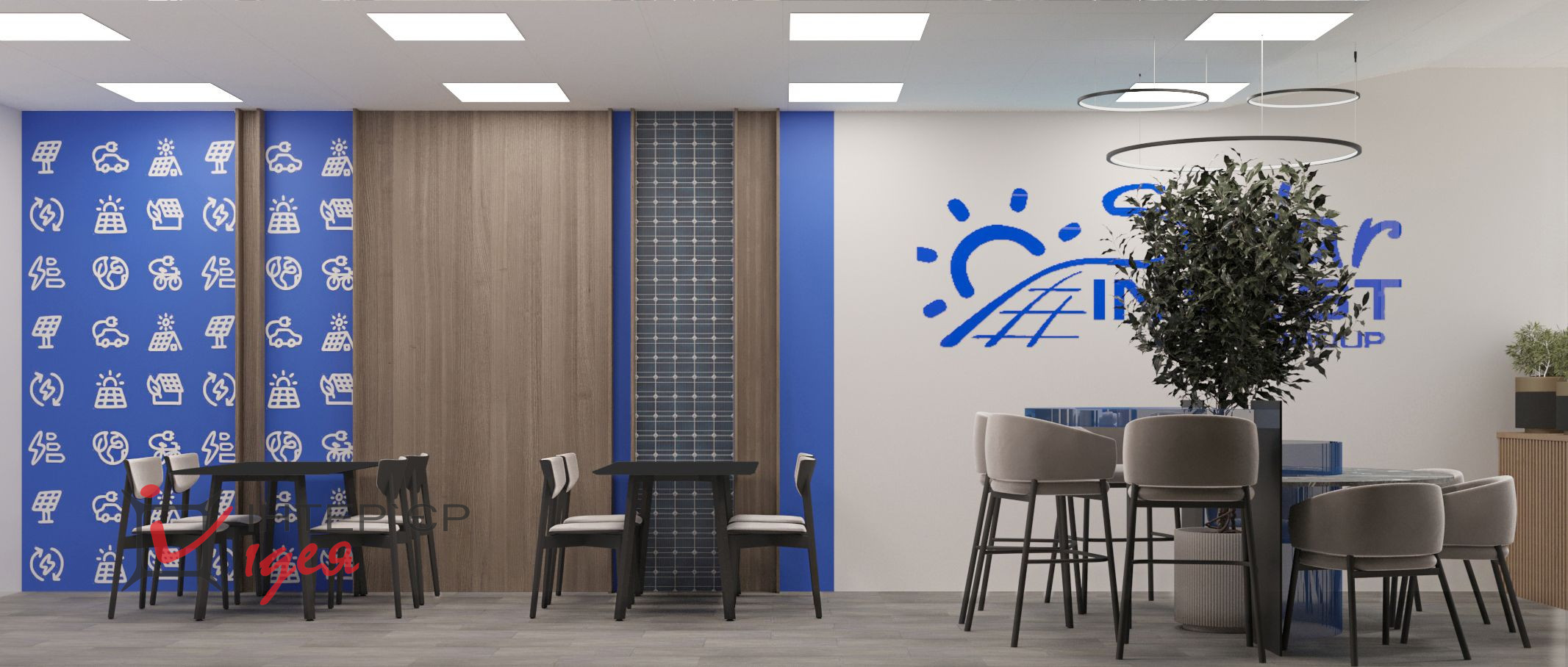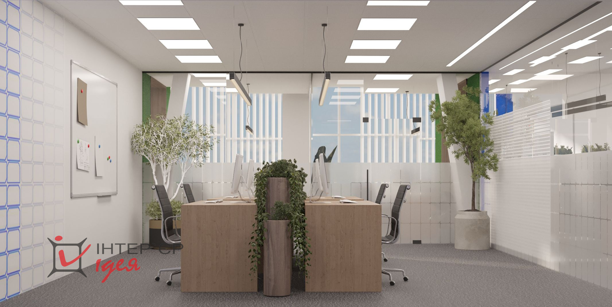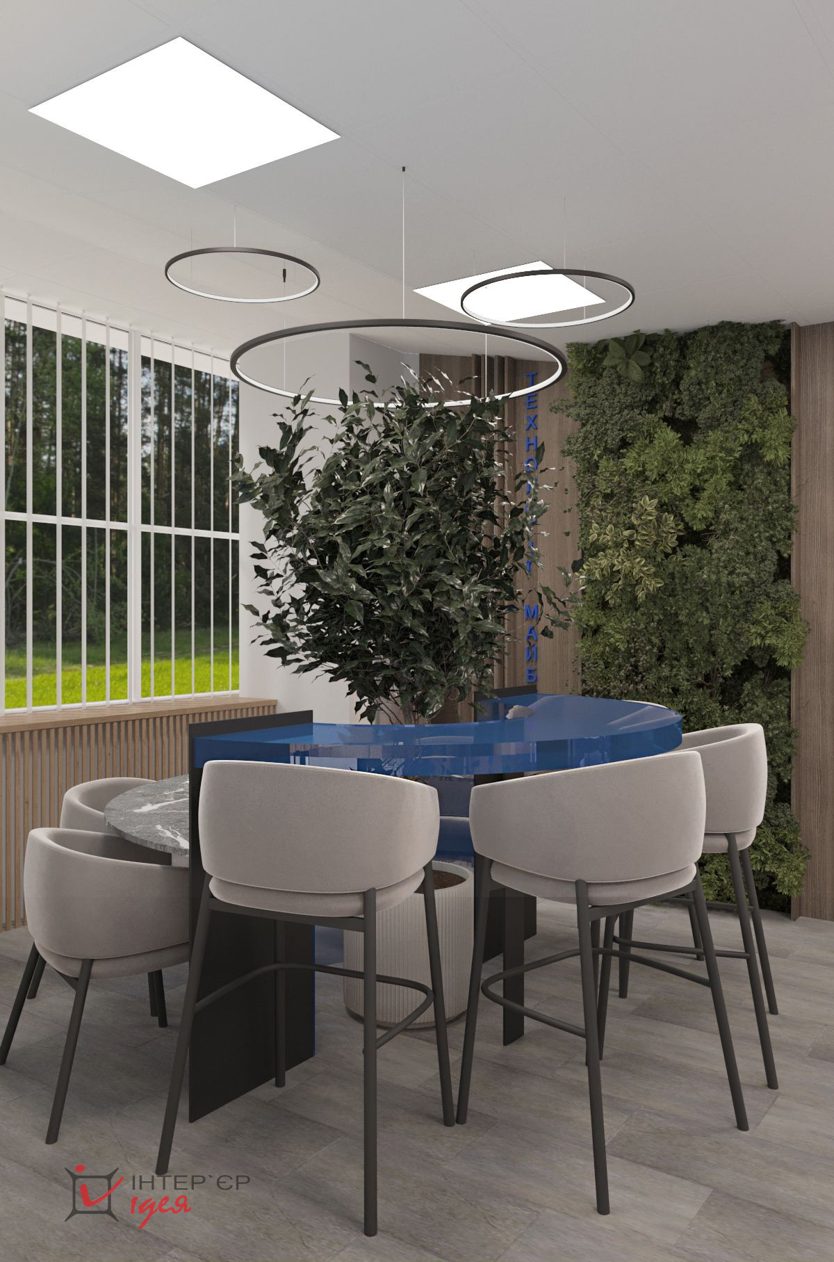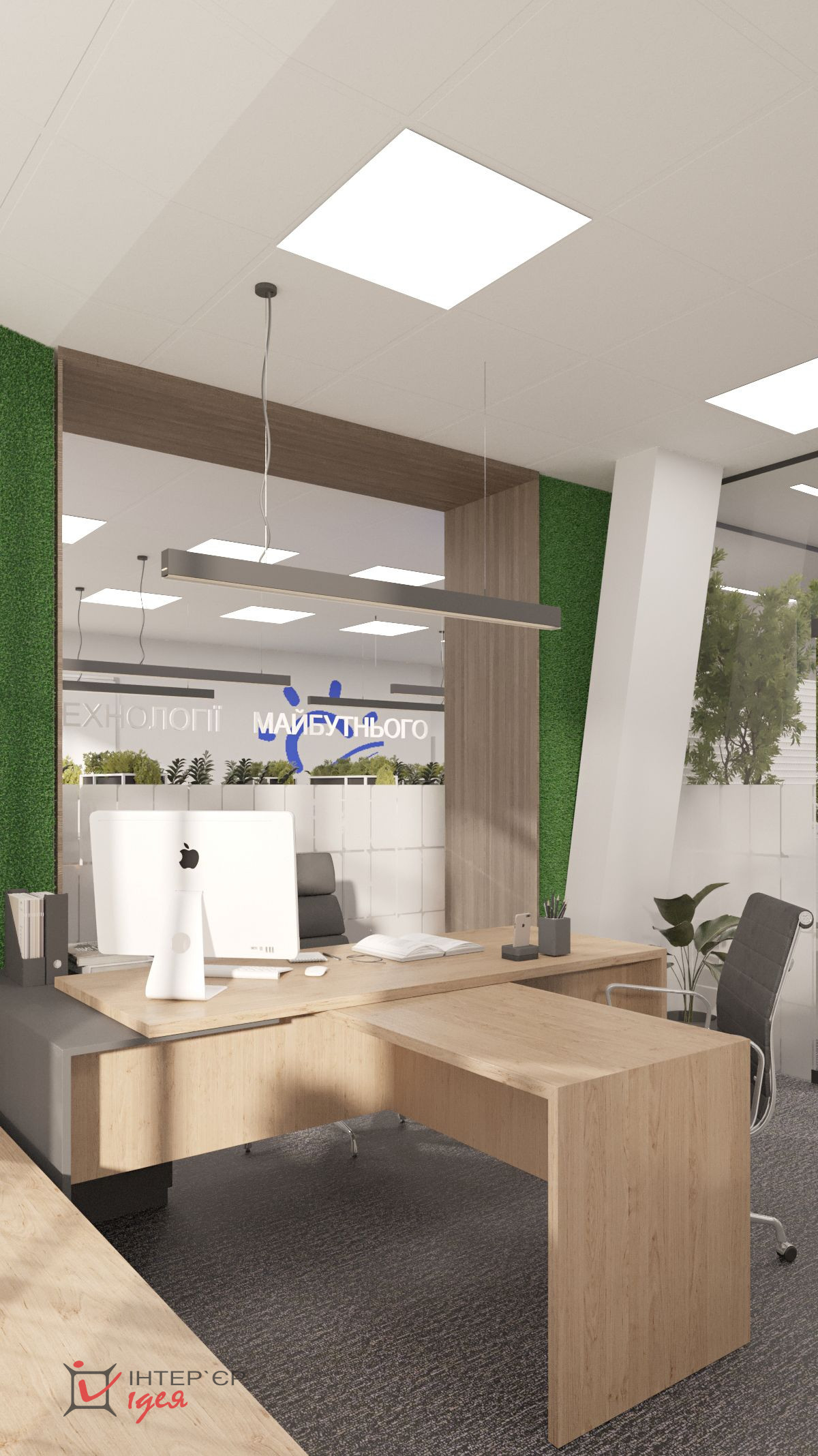 Переговорная комната с логотипом компании — это визуальный акцент, производящий первое впечатление, сочетая деревянные фактуры с живой зеленью и стильной мебелью.